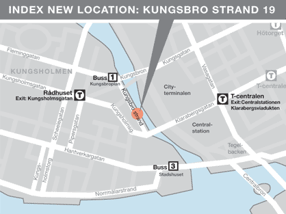 VISITING ADDRESS Kungsbro strand 17-19, Stockholm SUBWAY T-Centralen EXIT Centralstationen, Klarabergsviadukten alt: SUBWAY Rådhuset EXIT Kungsholmsgatan OPENING HOURS Wednesday 11am - 6pm, Thursday 11am - 6pm, Friday 11am - 6pm, Saturday 11am - 3pm, Sunday, Monday, Tuesday and Public Holidays (Red days) are closed. MAIL ADDRESS Kungsbrostrand 19, S-112 26 Stockholm, Sweden PHONE +46 (0)8 5021 98 38 E-MAIL info@indexfoundation.se