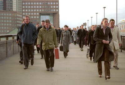 At Index, Young will show a variety of recent works. In the slide projection sequence Lines Made by Walking (2003), Young, dressed in a suit, walks backwards and forwards in the midst of a one-way crowd of commuters. Here Young restages Richard Long's seminal piece, ‘A Line Made by Walking’, transposing his act of 'drawing' a line into the ground by repeatedly walking through a physical landscape, into to the context of the contemporary globalised city in which her artistic act of 'drawing a line' seems to mirror the daily journey of the city's workers to and from the office. The artist's determination to move the crowd out of the way becomes a deadpan parallel for heroic artistic 'struggle', whilst the artwork is nevertheless immanent in the crowd as if everyone pictured might be engaged in their own form of social sculpure.