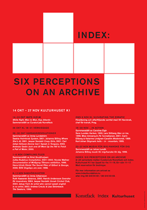 From October 14 until November 27, selected works from Index' archive of contemporary Swedish and international video will be on display at K1 space, Kulturhuset, Stockholm. The screening programme ”Index: Six Perceptions of an Archive” contains of five individual takes on the content of the archive plus a presentation of artist Mats Hjelm's trilogy White Flight, Man to Man and Kap Atlantis - produced by Index during the years of 1997 - 2002. The screenings are initiated and put together by the students of Konstfack's CuratorLab, a one-year course of study and practice for emerging practitioners in the field of art and theory. The project is a collaboration between CuratorLab, Index and Kulturhuset in order to present and make use of this wide range of artists videos, a collecting effort that started in the mid-nineties, still continuing today. The archive to this date contains of more than 250 titles, functioning both as a collecting strategy and an open system, to which artists can submit, update and withdraw their work at their own initative.