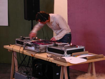 Dave Allen (Glasgow and Stockholm) presents his work, ‘Inverted oh-ton’ which could be described as a remix of music composed by German ensemble oh-ton (Kirsten Reese, Eckart Beinke and Frederic Rzewski). In this performance work, which lasts approx. 30 mins, Dave Allen uses two vinyl records of the same recording. On one record the sound is inverted, meaning that played separately the records sound identical, but played simultaneously on the same audio equipment the sound negates itself – what remains is silence. In Dave Allen’s efforts to play the records in absolute synchronisation, so that music becomes silence, we could say he takes the position of an anti-DJ.