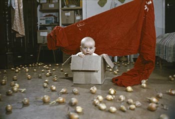 Activities with Dobromierz (1972–74), almost 900 photographs and slides, was the result of a continued research in visual and spatial form. It can be described as a series of documented installations realized mainly in the artists’ home environment, with objects, household items, fruits, and vegetables, in innumerable configurations, creating a multitude of actual possibilities, and always with their baby son in the centre.