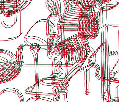 At Index, Charlotte Enström presents a new work, a wall drawing, which creates an effect similar to 3D by the use of several layers of thin green and red lines. The result is an image which is hard to focus on, lending the desirable objects a disturbing sense of uneasiness.