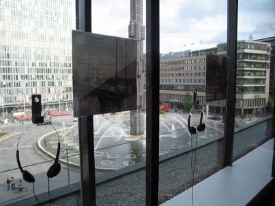 Via three listening stations at Kulturhuset in Stockholm, each with a headphone fixed at the side of a photographed image – in fact a record-sleeve – Pythagorean Audio Guide provides visitors with narrated information on the objects depicted in the image. Using the mere glass panes of Kulturhuset’s panorama windows as transparent walls, images are juxtaposed with the view overlooking the city. A fourth station will direct the viewer’s attention to relationships happening in the urban architecture. These sets of information are all results of the artist’s meticulous research at site previously this year.