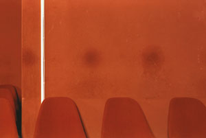 'I hörsalen' (In the Lecture Room), is the title of the series in the room at street level. Furthest back in the lecture room, the wall gives listeners the chance to rest their heads a moment. Hours and hours of lectures have left thick layers of deposits until finally it has grown into a repugnant pattern. The lecture room with its orange chair backs is just as gaudy as the home is pale. The public against the private.