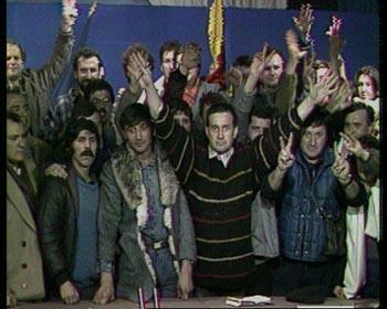 The main focus of the exhibition will be “Videogramme einer Revolution” from 1992. The film deals with the role of the media during the revolution of December 1989 which, after a number of days, ended with the fall and death of the Romanian dictator Ceausescu. For his film, Farocki has chosen to work only with archive footage of the events; clearly indicating how video/ TV images not only describes history but actually create it. A central place in the Romanian revolution that was of fundamental importance to the course of events was the TV- station in Bucharest. Occupied by demonstrators the station broadcast non-stop throughout the events and became a stage where part of the drama took place in front of the cameras and the viewers. The demonstrators' seriousness and inexperienced handling of the medium contrasts starkly with and reveals the structures of the TV- medium in itself. ”Videogramme einer Revolution” was made in collaboration with the Romanian media and literature theorist Andrei Ujica.