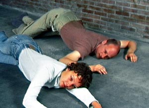 As always with Aernout Mik, a mix of the common and the absurd. In his video installation, we see two people lying down on a shaking pavement. It is unclear what has happened to them.